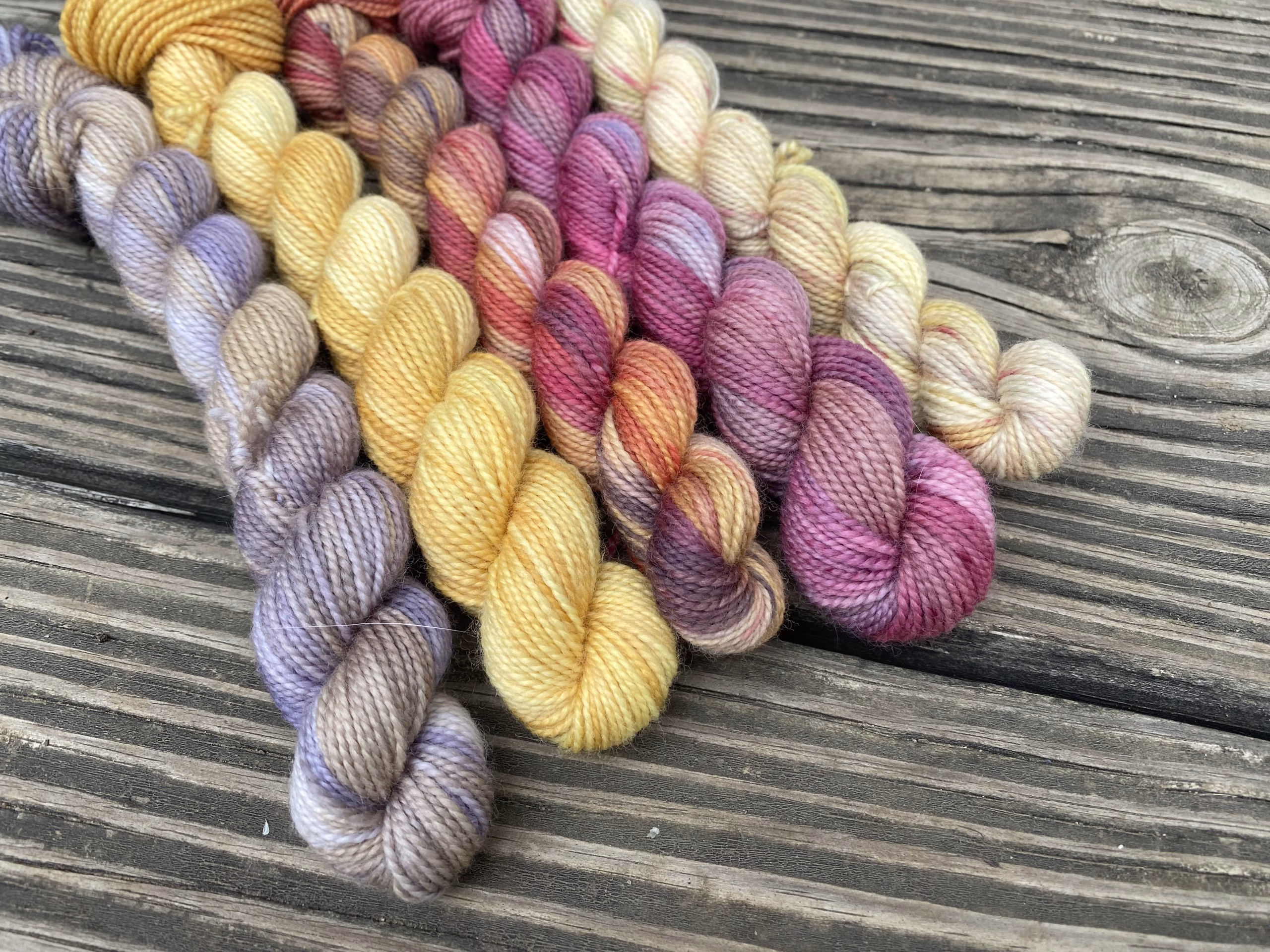 Each set contains five one of kind 20 gram fingering weight mini skeins in the Berry Tough Sock base (80% Superwash Merino/20% Nylon). Minis were created to coordinate with the 2025 Halloween Colorways – Trick or Treat and Monster Mash.